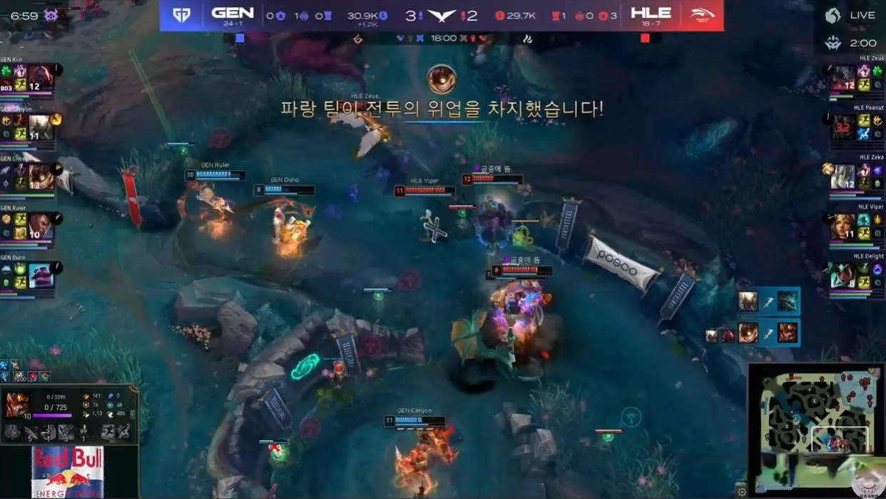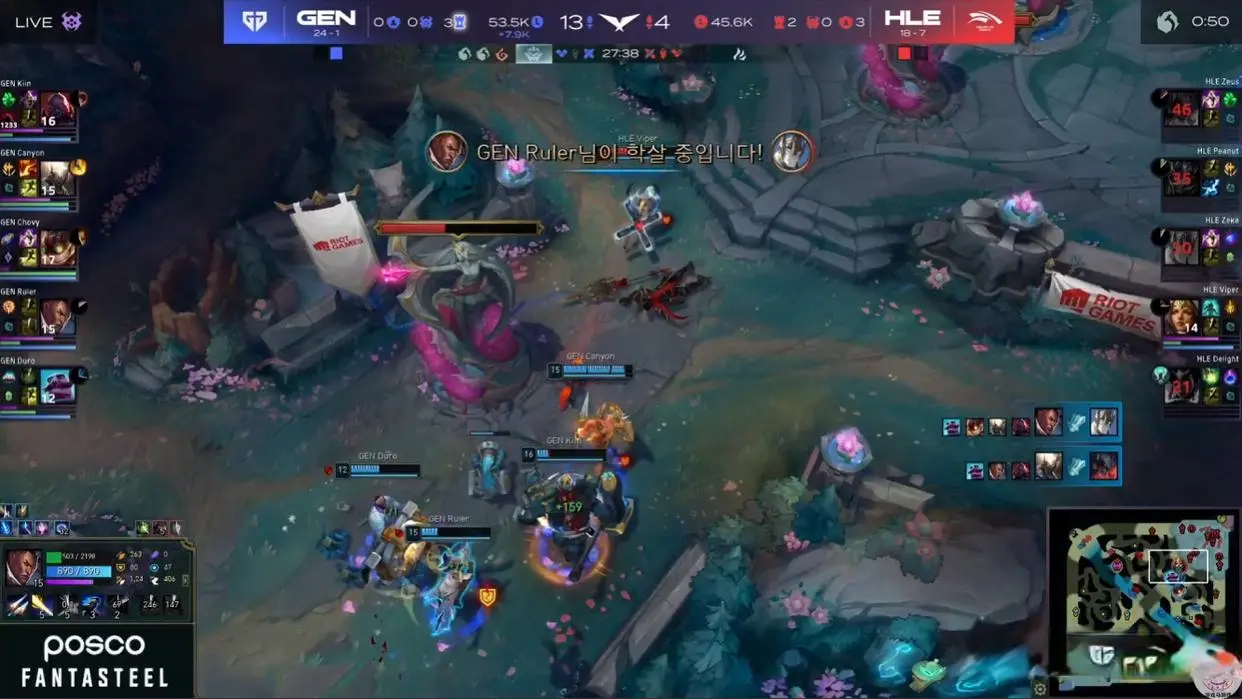 今天Ruler拿到了POM,GenG在第一周输给T1之后,调整很快目前又是拿到了一波6连胜。因为继承了第二赛段的成绩,所以也早早锁定了全球总决赛名额,以及LCK年度总决赛的季后赛第二轮最高顺位。T1和GenG,仍然是今年韩国LCK争冠实力最强的队伍。